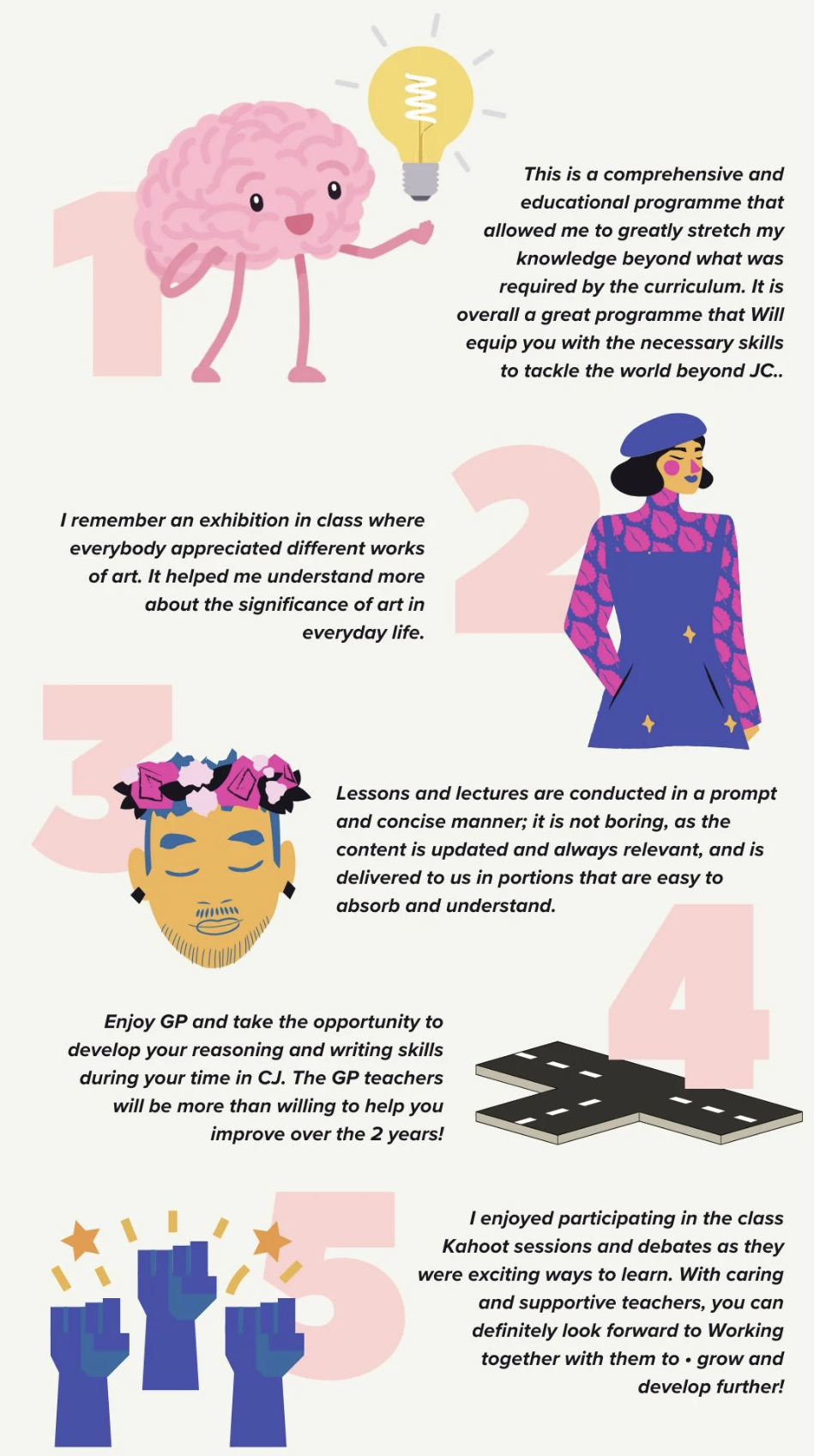 While students should find the essay writing and comprehension components familiar, having experienced a similar examination format at the O-Levels, General Paper demands depth of argumentation and critical thinking skills that are much more advanced than at the O-Level. CJC provides students with a foundation in thinking skills and content to allow them to craft well-reasoned arguments.
